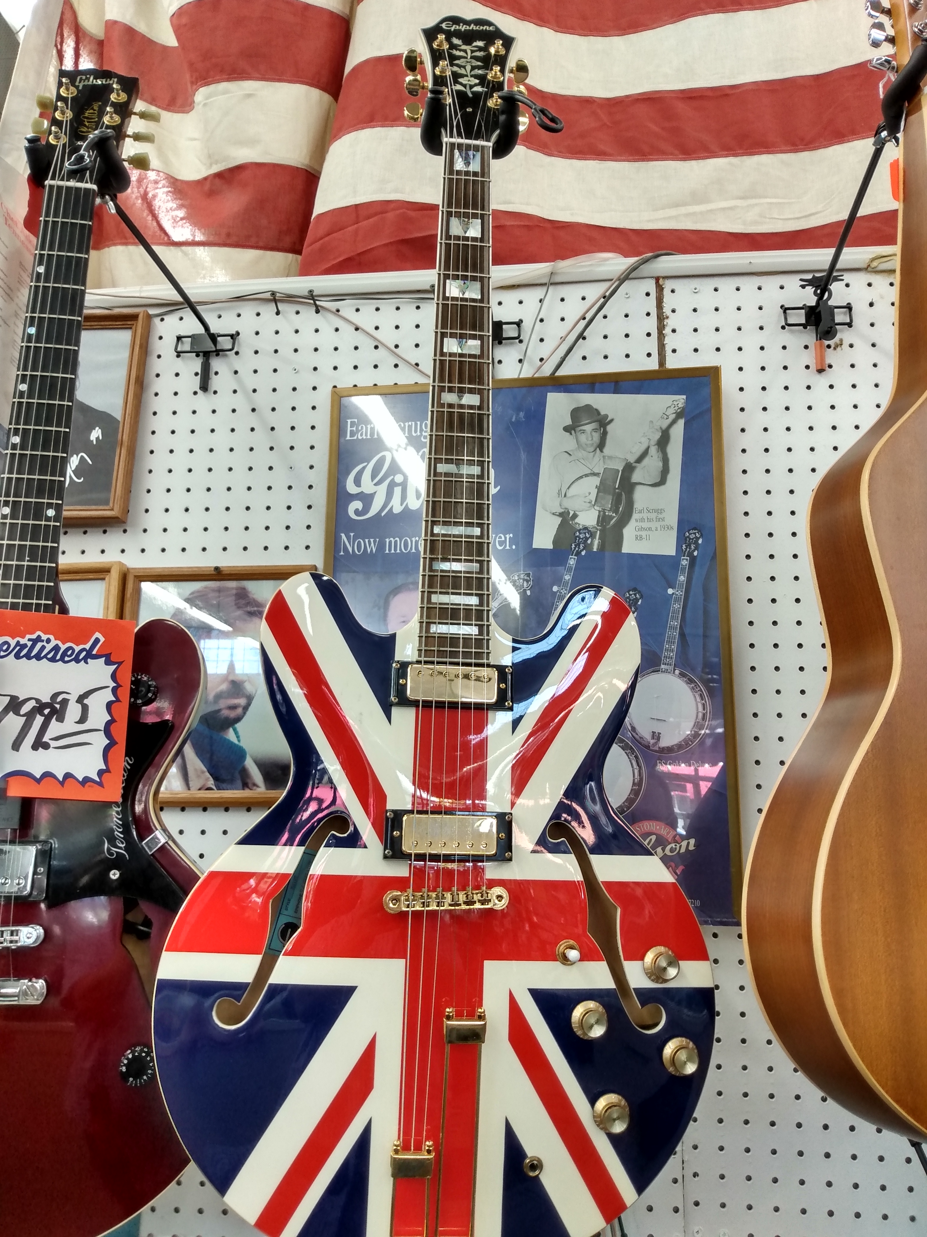 The Epiphone Limited Edition Union Jack Sheraton use the same semi-hollow construction and comfortable neck of the Sheraton II, but features mini-humbuckers and a custom "Union Jack" finish as an homage to Noel Gallagher's Supernova Sheraton.